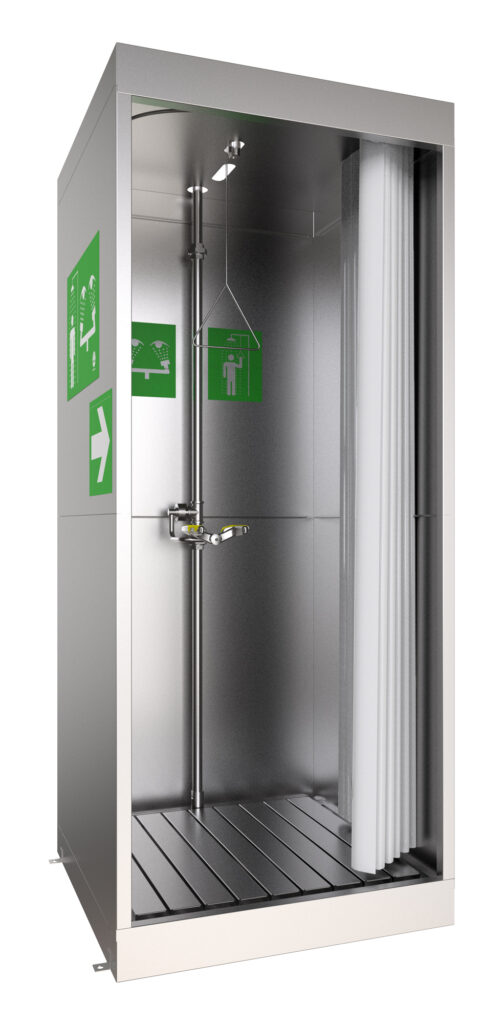 The stainless steel enclosed safety shower model is ideal for indoor applications such as data centers, chip manufacturing and other high-tech facilities, laboratories, pharmaceutical and chemical processing facilities, and other clean room applications.